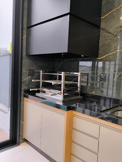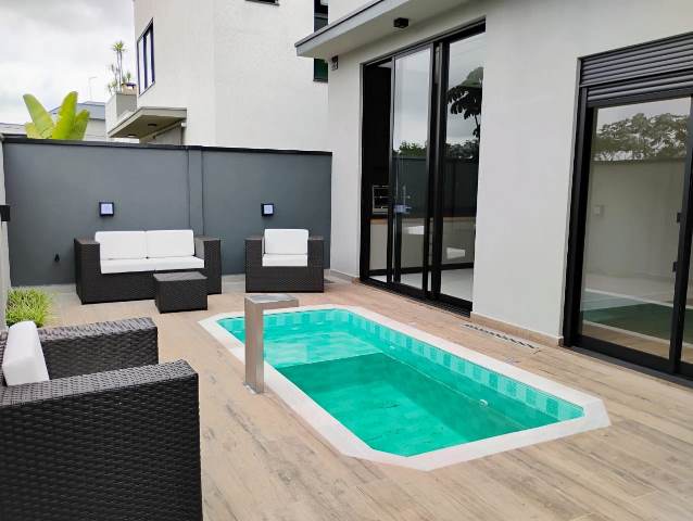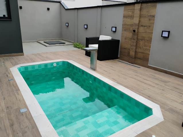 Possui área gourmet com churrasqueira, piscina e 4 vagas de garagem.