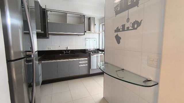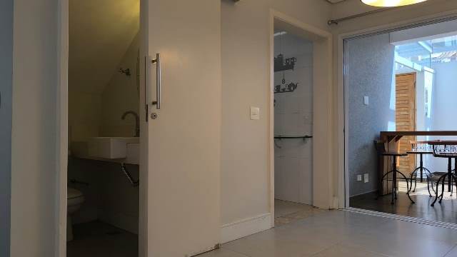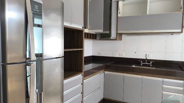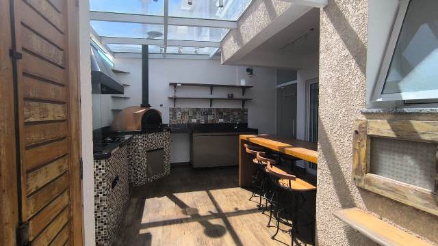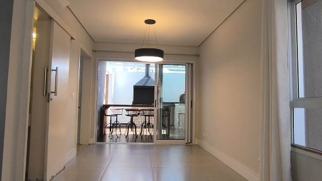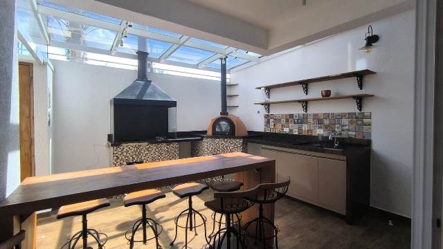 Piso inferior com sala de estar, sala de jantar, lavabo, cozinha com geladeira e coifa, área gourmet com armários, cooktop, forno de pizza e churrasqueira.