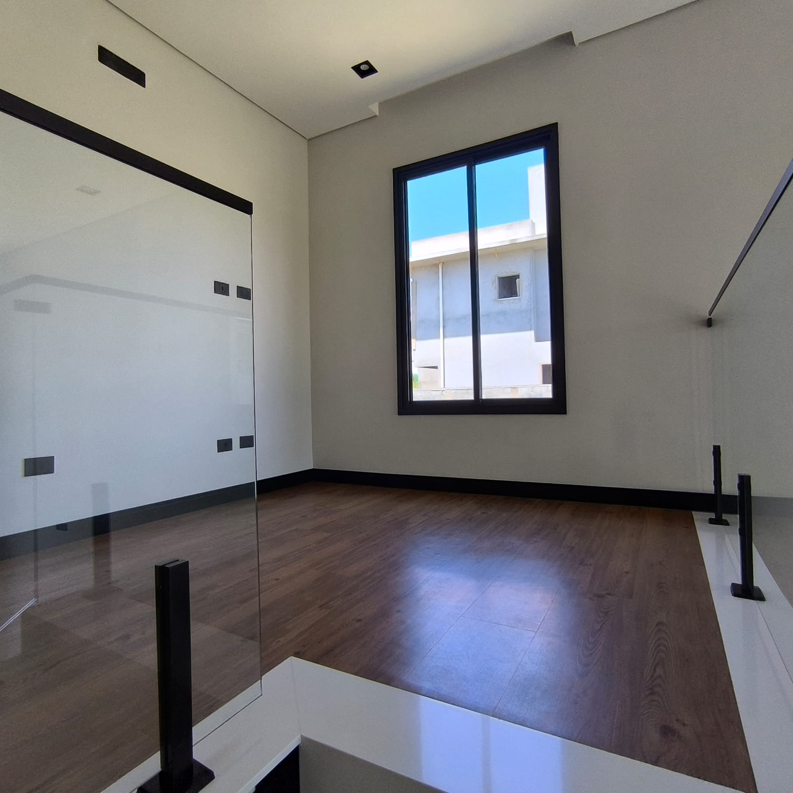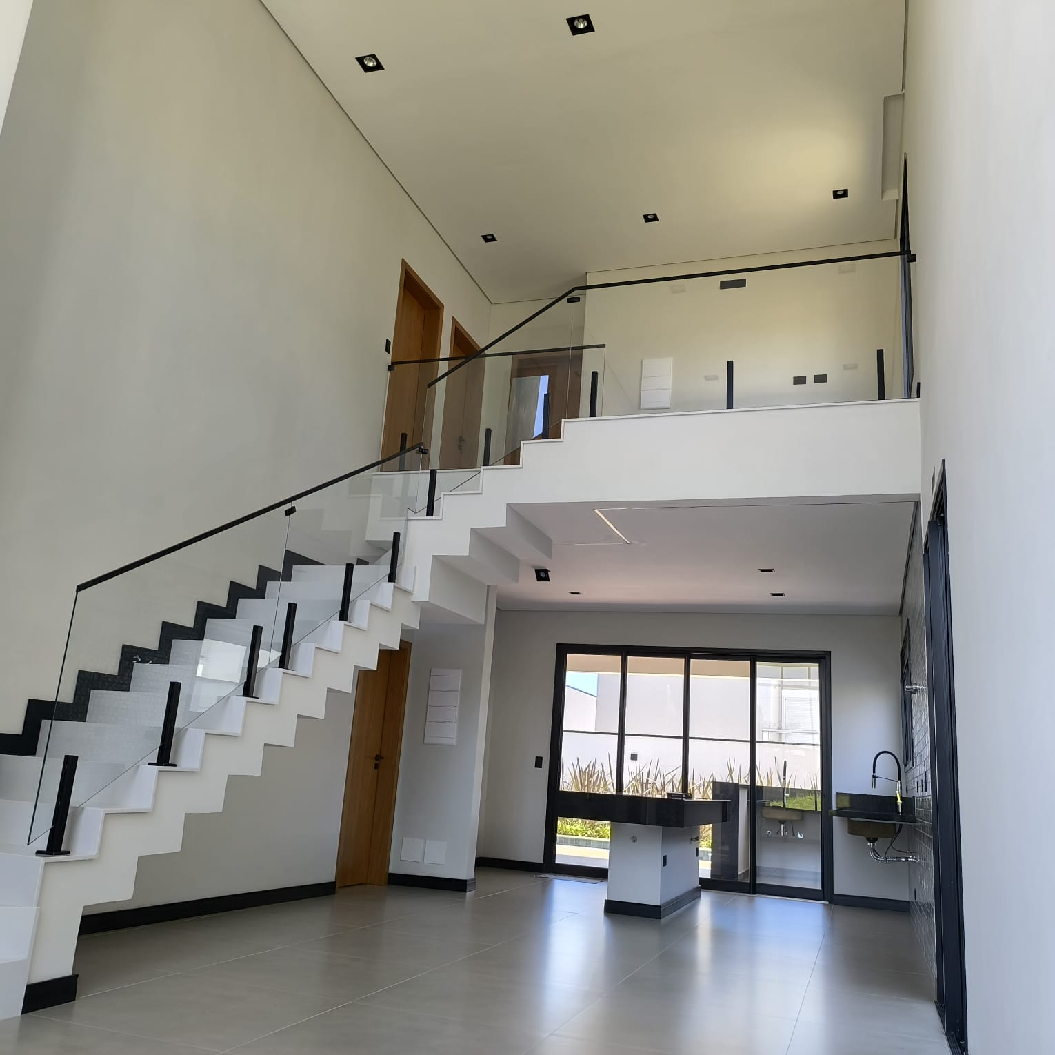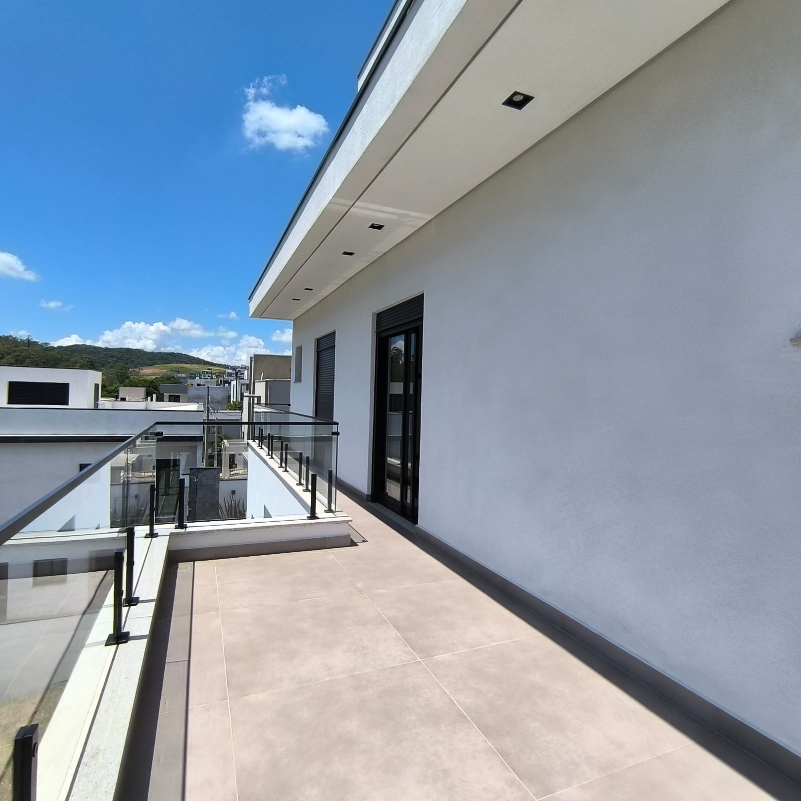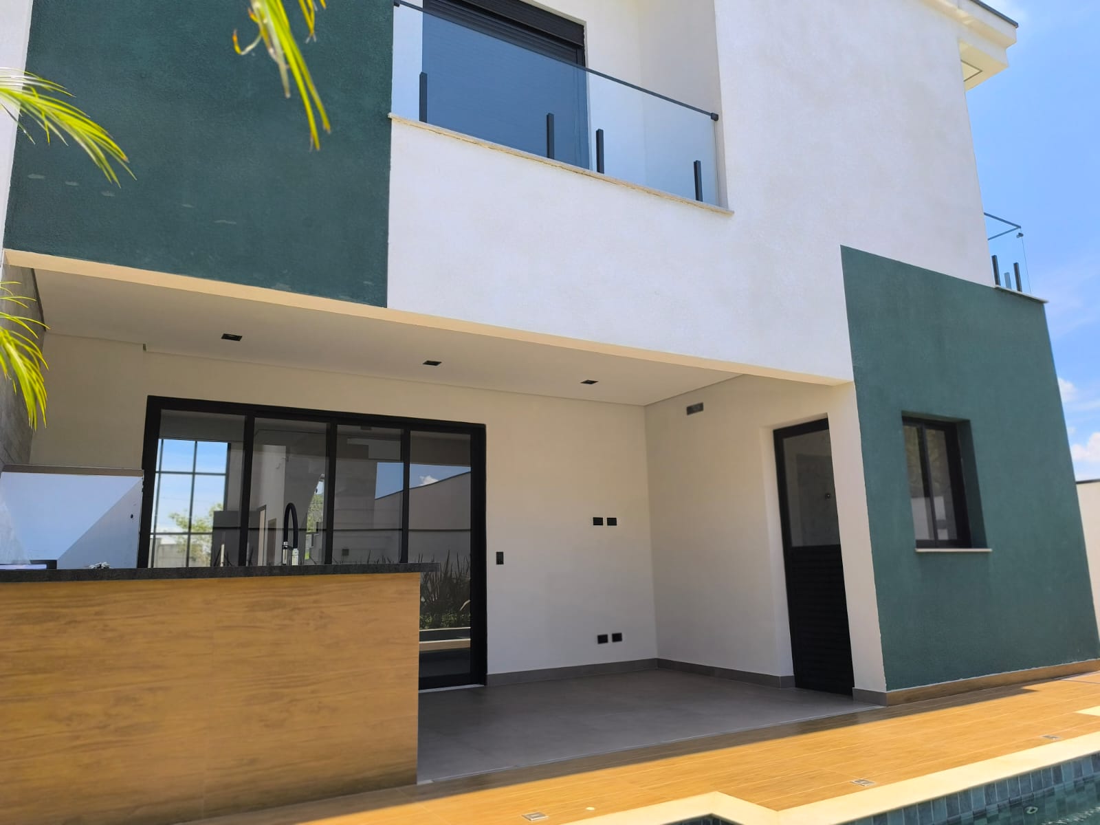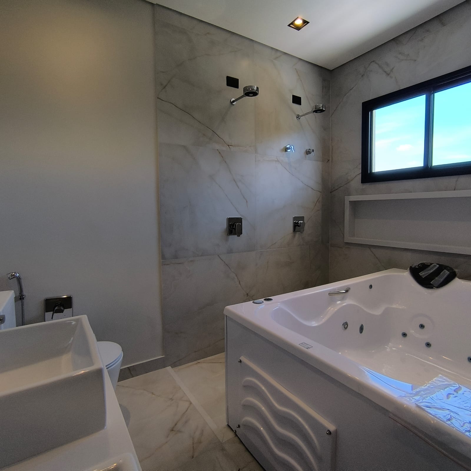 Possui sala de estar, sala de jantar, lavabo, cozinha, área de serviço, sala íntima, 4 suítes sendo 1 no piso inferior, área gourmet, piscina, banheiro na área externa e 4 vagas de garagem sendo 2 cobertas.